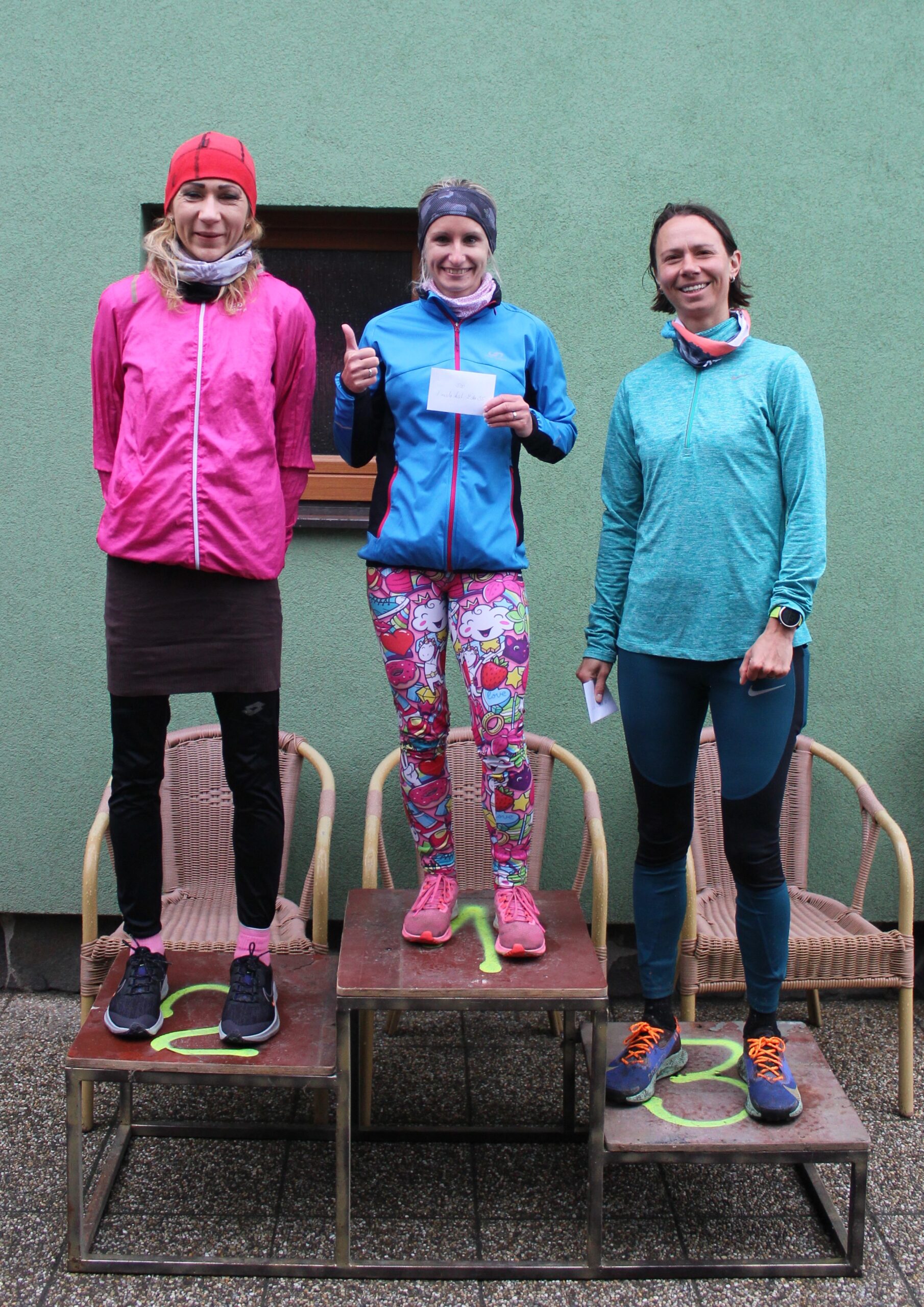 Z počátku jsem se držela čelní skupinky, kterou tvořili jen muži, Petra a já. Postupně se to roztrhalo a já si běžela sólo za nimi. Za mnou pár chlapů a Magda. Já si s přehledem držela druhou pozici ženy a takto doběhla až do cíle. Při běhu už nám naštěstí nepršelo a na vyhlašování vítězů, které se konalo venku, také ne. V kategorii žen do 44 let jsem obsadila první místo, Petra už letos postoupila do kategorie žen nad 45 let, kde Ali skončila bronzová a Radek ve své kategorii mužů do 59 let bral také bronz.
