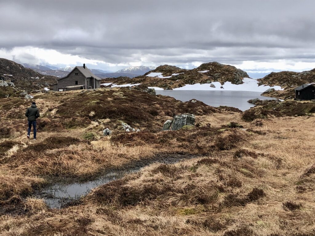 Cestu k ní hledáme v mapách. Procházíme pod heliportem místní nemocnice a díky zkratce mezi patologií a biochemickou laboratoří se dostáváme přímo ke spodní stanici lanovky. Lanovka jezdí a lidi žádní. Ideální kombinace. Už že spodu vidíme, že je nahoře regulérní mlha. To už ideální není. Přesto kupujeme lístky za 860 Kč/os. Na jednom kilometru vyjedeme o téměř 600m výše. Tam najednou foukne vítr a mlha zmizí. Nabídne se nám tak úžasný výhled na Bergen a okolní krajinu. Máme radost také z místní hospody. Nejdeme pít, ale poprosit obsluhu o úschovu zavazadel. Nechce se jim, ale nemají na výběr. Chceme si projít asi 5 km dlouhý okruh kolem jezer na náhorní plošině. Jen co opustíme z dohledu horní stanici lanovky, otevře se před námi syrová severská příroda. Jezera jsou tady v kombinací s prostými chatami, které jsou vkusně usazeny do krajiny. Norské domy snů.