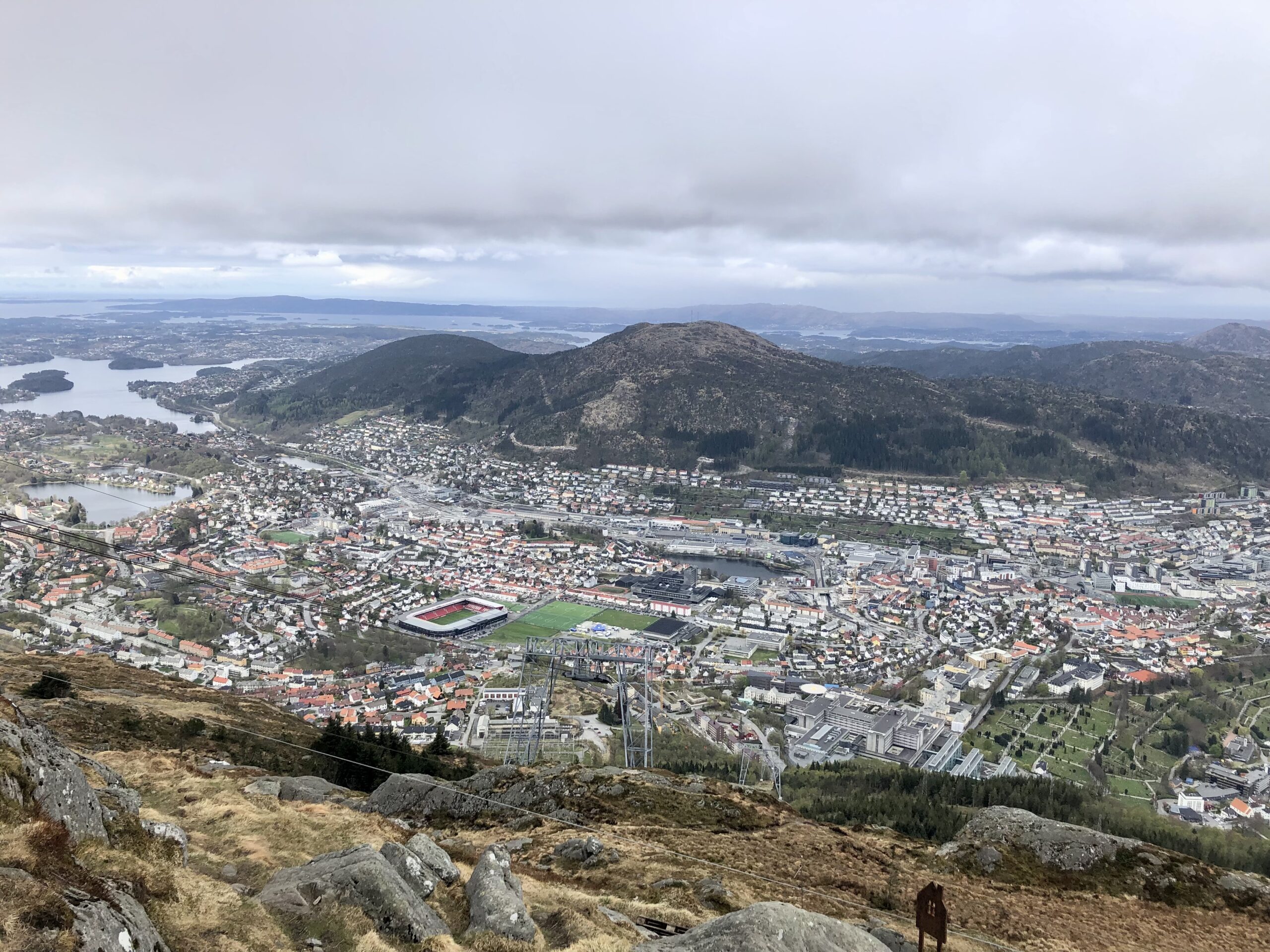 Trasu dlouhou 1459 km překoná Airbus321 za dvě hodiny a kousek. Po osmé hodině tak už stojíme u tramvaje na letišti v Bergenu. Ta nás odveze za 40 minut přímo do centra města. Tohle však nechceme. Vystupujeme v půli cesty u stadionu místního fotbalového klubu SK Brann. Fotbal nás (dnes) nezajímá. Cílem je vrch Ulriken pod který jezdí kabinková lanovka.