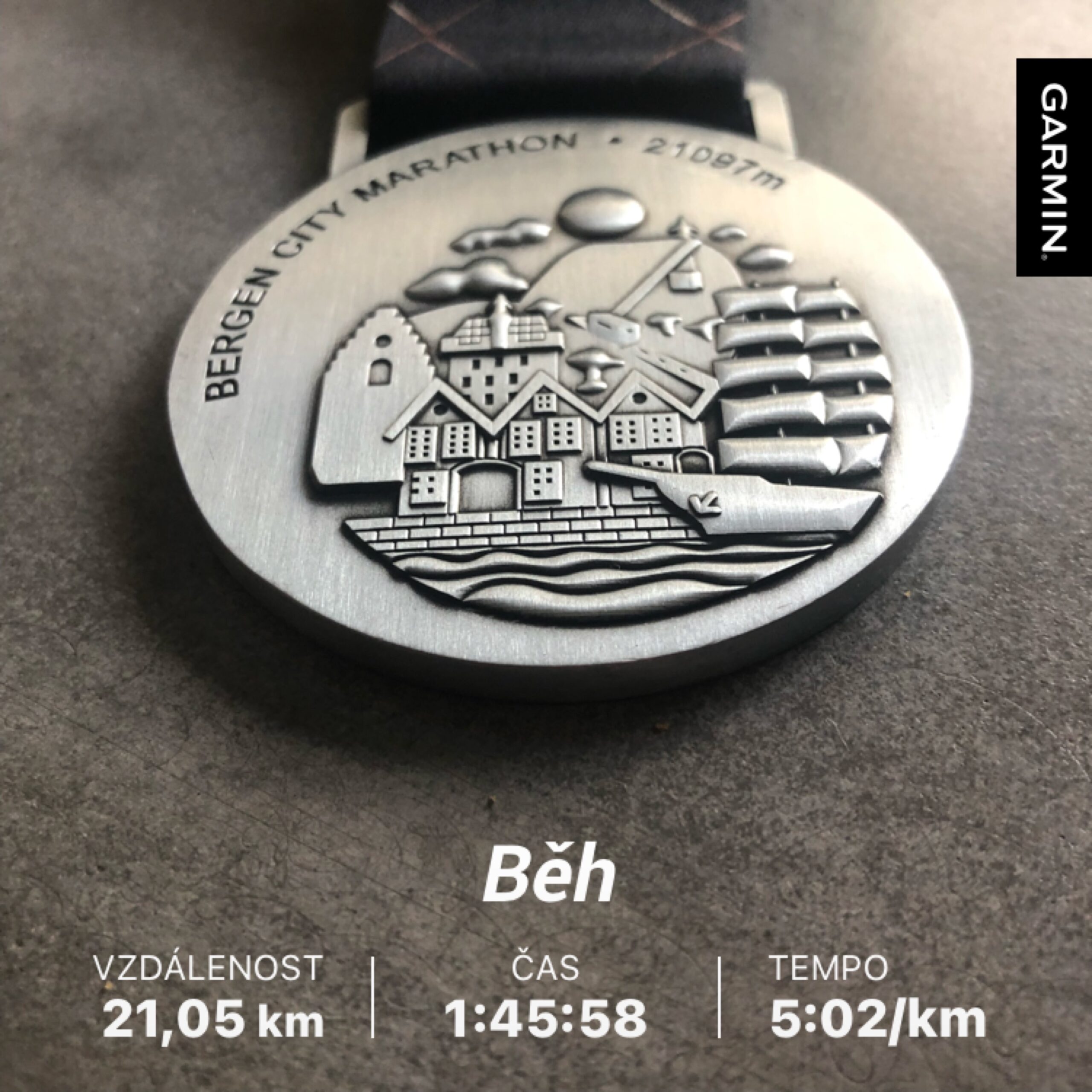 Už vím, že čas 1:49 co jsem si dal dnes za cíl splním. Větší radost mě dělá dobře rozvrhnuté tempo. V pohodě tak probíhám cílem a zastavuji hodinky na čase 1:45:58 hod. Pár sekund jsem zvládnul ukrojit i díky fandění Valdy, který doběhl přede mnou. Totéž se snažím vrátit Lubošovi, kterého vidím cestou na hotel. Beru krásnou finišerskou medaili a konečně kelímek s vodou. Při běhu nějak nebyl čas.