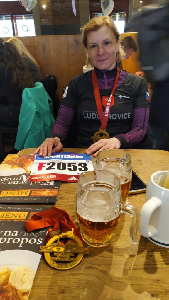 Tady míjím v protisměru za hlasitého povzbuzování první Keňany, kteří už finišují do cíle. Neuvěřitelně krásný pohled! Oni už v cíli-první tři to dali pod hodinu(všichni z Keni) a já teprve v polovině trasy, docela demotivující. Ale běží se mi pořád dobře, ikdyž ten protivítr je dost nepříjemný. Lidé kolem skvěle fandí, občas si s někým „plácnu“ a po trase jsou různé stage s hudbou. Je fajn to zase po dvou letech covidových restrikcí opět zažít. Užívám si tu atmosféru, kochám se krásami Prahy a běžím, tak nějak pocitově. Vůbec neřeším čas. Ale 20.kilometr už je znát, nohy už ztěžkly ,ale pořád jsem ještě v pohodě. Jen už nejde zrychlit. Mám pocit, že znatelně zpomaluju, ale radši ani nesleduju tempo. A hele, cedule 600 metrů do cíle! To je výzva! Zkusím vystupňovat tempo a poslední metry ,přes Mánesův most, si užívám. Vbíhám na červený koberec a finišuju. Skoro všechny předbíhám, posledních 100 metrů si maximálně užívám. S úsměvem od ucha k uchu probíhám cílem. Zvládla jsem to! A fakt jsem si to užila,ani zima nevadila. Mrknu na hodinky a nevěřím-dala jsem to pod 1:50,takže nový osobák a snad jsem splnila alespoň částečně očekávání BKL. Ale stále je co zlepšovat! V cíli na mě čeká Luděk, doběhl pár minut přede mnou. Jdeme se převléct, těšíme se na suché a teplé oblečení. A pak kujeme pikle-PIVO a něco k snědku by bylo fajn. Zapadneme do nejbližší Kozlovny-je tady příjemně teplo a první pivo jen zasyčí.