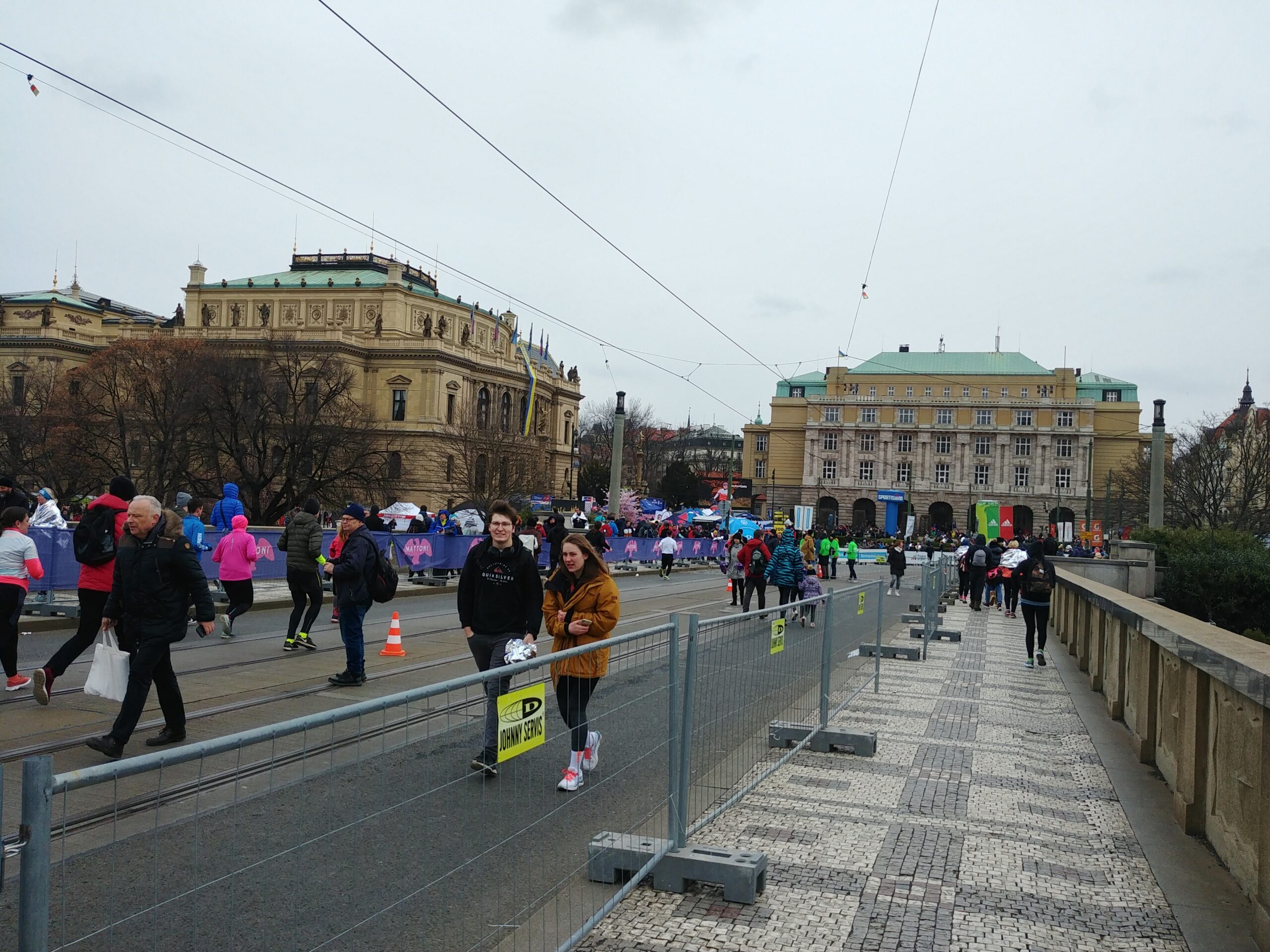 Je sobota ráno, 2.4.2022. Dnes se velkolepá snídaně nekoná, možná zítra. Dávám si osvědčenou ovesnou kaši a pro zásobu energie přidávám ovoce a velkou lžíci Nutely. Holky si dávají do nosu, já už mizím na pokoj. Začínám být dost nervózní. Trochu váhám, co si obléct. Sice nesněží, ale teplota kolem nuly a pocitově ještě nižší. Jediné, co mě uklidňuje, že těm Keňanům bude mnohem větší zima, než mně! Vrstvím oblečení, čepku, rukavice a nakonec teplou zimní bundu. Budu se s ní těžce loučit, ale v ní se běžet fakt nedá. V metru potkávám spoustu běhuchtivých bláznů. Přesun na Náměstí Jana Palacha, odkud se startuje, probíhá hladce. Teď mě čeká ta nepříjemná čast – vystát si frontu na TOI TOIku. Pak přesun k šatnám, odložit svrchní oděv a pomalu si zvykat na zimu. Je fakt kosa! Odnesu věci do úschovny-mají to dost dobře vychytané-nikde žádné fronty. A tady narazím na známou tvář. Potkávám Luďka z Vratimova, se kterým jsem běžela i v Kobeřicích. Je to skvělý pocit, mít tu nějakého kamaráda. Přesouváme se na start a řešíme strategii. Hlavně ale to, jak dneska nezmrznout. Popřejeme si hodně štěstí a hlavně si to užít! Adrenalin stoupá a čekáme na startovní výstřel. Hned po něm už zní první tóny Smetanovy Vltavy. To jsem vždycky naměkko. Než se dav rozpohybuje, tak tak nějak popocházíme, ale po proběhnutí startovní branou, se už rozbíháme. Probíháme kolem Karlova mostu, přes Palackého most na druhý břeh Vltavy a přes most Legií zpátky kolem Karlova mostu ke startu. Je to zhruba polovina trasy.