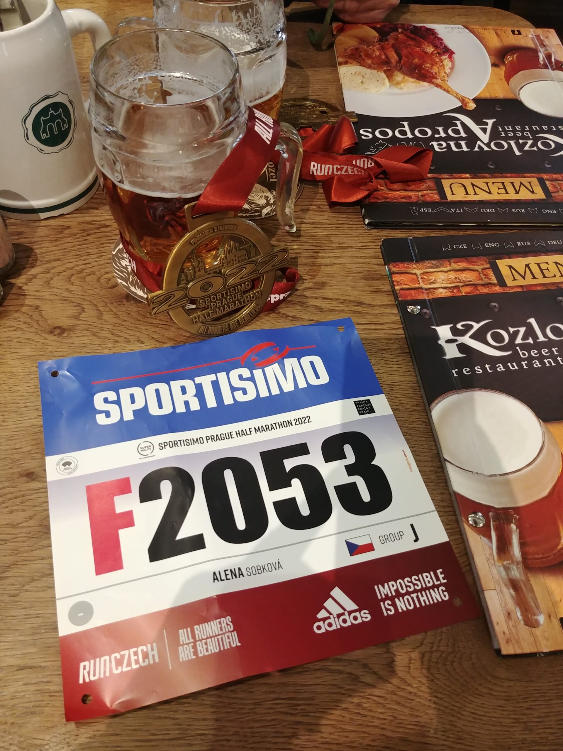 Tady míjím v protisměru za hlasitého povzbuzování první Keňany, kteří už finišují do cíle. Neuvěřitelně krásný pohled! Oni už v cíli-první tři to dali pod hodinu(všichni z Keni) a já teprve v polovině trasy, docela demotivující. Ale běží se mi pořád dobře, ikdyž ten protivítr je dost nepříjemný. Lidé kolem skvěle fandí, občas si s někým „plácnu“ a po trase jsou různé stage s hudbou. Je fajn to zase po dvou letech covidových restrikcí opět zažít. Užívám si tu atmosféru, kochám se krásami Prahy a běžím, tak nějak pocitově. Vůbec neřeším čas. Ale 20.kilometr už je znát, nohy už ztěžkly ,ale pořád jsem ještě v pohodě. Jen už nejde zrychlit. Mám pocit, že znatelně zpomaluju, ale radši ani nesleduju tempo. A hele, cedule 600 metrů do cíle! To je výzva! Zkusím vystupňovat tempo a poslední metry ,přes Mánesův most, si užívám. Vbíhám na červený koberec a finišuju. Skoro všechny předbíhám, posledních 100 metrů si maximálně užívám. S úsměvem od ucha k uchu probíhám cílem. Zvládla jsem to! A fakt jsem si to užila,ani zima nevadila. Mrknu na hodinky a nevěřím-dala jsem to pod 1:50,takže nový osobák a snad jsem splnila alespoň částečně očekávání BKL. Ale stále je co zlepšovat! V cíli na mě čeká Luděk, doběhl pár minut přede mnou. Jdeme se převléct, těšíme se na suché a teplé oblečení. A pak kujeme pikle-PIVO a něco k snědku by bylo fajn. Zapadneme do nejbližší Kozlovny-je tady příjemně teplo a první pivo jen zasyčí.