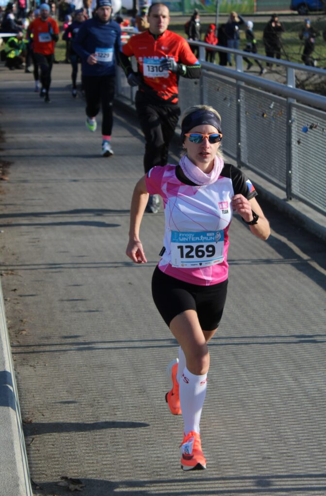 V 11 hodin bylo odstartováno, kluci to napálili v tempu 3:30 km/h, já si zpomalila ke 3:50 km/h a přede mnou byla jedna neznámá žena a jedna juniorka, která však po cca 500 m postupně odpadávala. Tak jsem se začala přibližovat oné neznámé ženě, co si to pádila přede mnou ve velké rychlosti. Do třetího kilometru jsem jí byla v patách a pak jsem si řekla: „Teď nebo nikdy!“